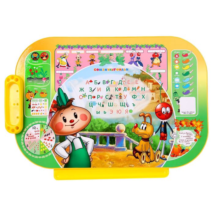 На рабочей поверхности изображены обучающие материалы: алфавит, цифры, примеры, задачки и загадки, кроссворд, геометрические формы и цвета. Живописный фон и герои доброго мультфильма помогут ребёнку в увлекательной форме приобрести новые знания.