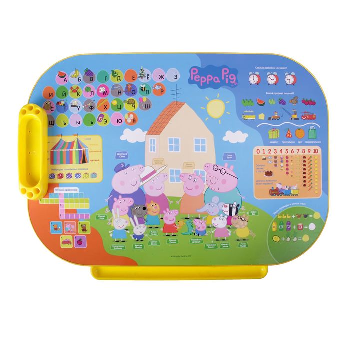 На увеличенную, по сравнению с классическими моделями, столешницу (550 х 800 мм) нанесены изображения героев популярного мультфильма, русский алфавит и предметы разных форм и цветов. Ребёнку предстоит выполнить несколько увлекательных заданий: разгадать кроссворд, определить, сколько времени на часах и решить примеры по картинкам.