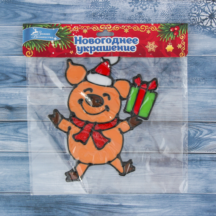 Наклейка на стекло "Свинка с подарком" 13*15 см