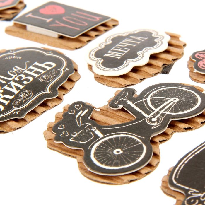 Многослойные наклейки из гофрокартона становятся всё популярнее с каждым днём! Они мгновенно привлекают внимание яркостью, объёмом и оригинальностью. Изделия подходят для украшения любого скрап-объекта: альбомов, блокнотов, открыток. Особенно хорошо декор сочетаются с пакетами из крафт-бумаги.