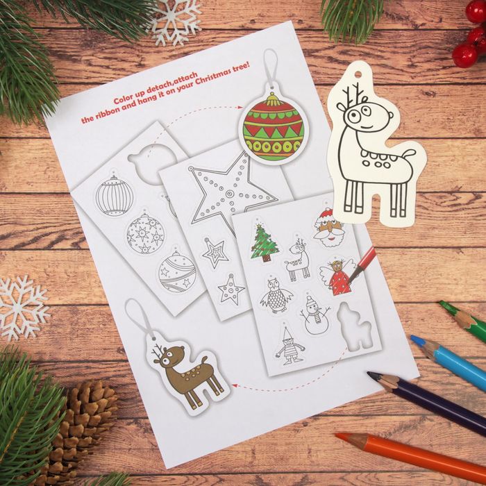 Порадуйте ребёнка набором для изготовления новогодних подвесок. Ему предстоит раскрасить каждый рисунок в любимые цвета, а затем выдавить фигурки из основания и задекорировать ими ёлочку.