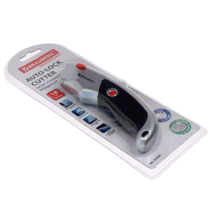 Нож мощный, металлический корпус, фиксатор, резиновые вставки, форма лезвия-трапеция, + 5 лезвий, блистер — это прочное универсальное изделие из металла и пластика. Пригодится в офисе, дома или в школе. Имеет демократичную цену.