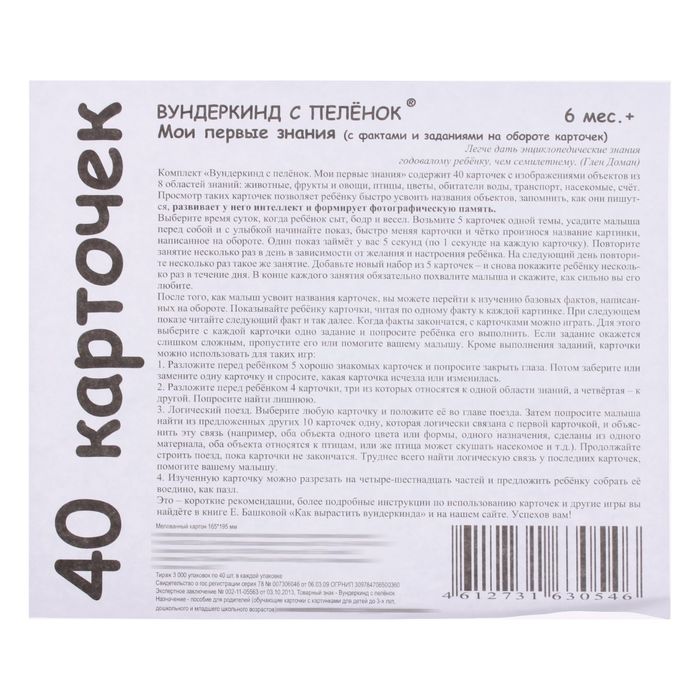«Мои первые знания» — комплект карточек по развивающей методике Глена Домана. Американский нейрохирург создал систему для реабилитации детей с нарушениями умственной деятельности. Учёный демонстрировал им изображения с написанными словами и громко озвучивал их. Благодаря этому активировались здоровые клетки мозга, и маленькие пациенты быстрее и эффективнее воспринимали информацию, учились говорить и читать.