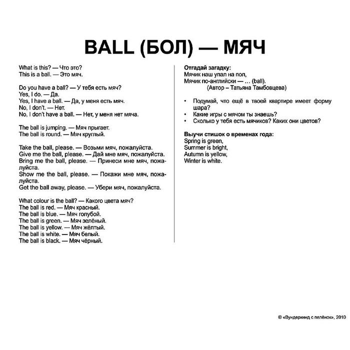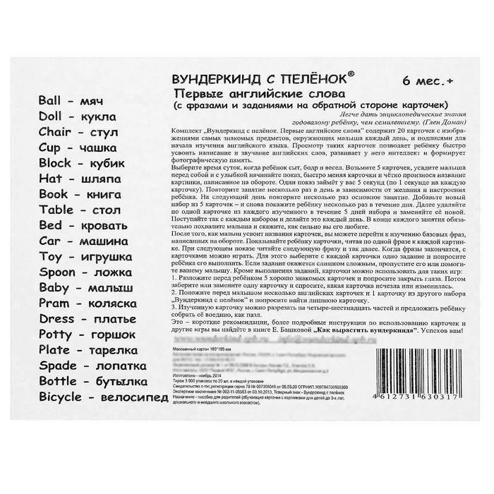 «Первые английские слова» — комплект карточек по развивающей методике Глена Домана. Американский нейрохирург создал систему для реабилитации детей с нарушениями умственной деятельности. Учёный демонстрировал им изображения с написанными словами и громко озвучивал их. Благодаря этому активировались здоровые клетки мозга, и маленькие пациенты быстрее и эффективнее воспринимали информацию, учились говорить и читать.