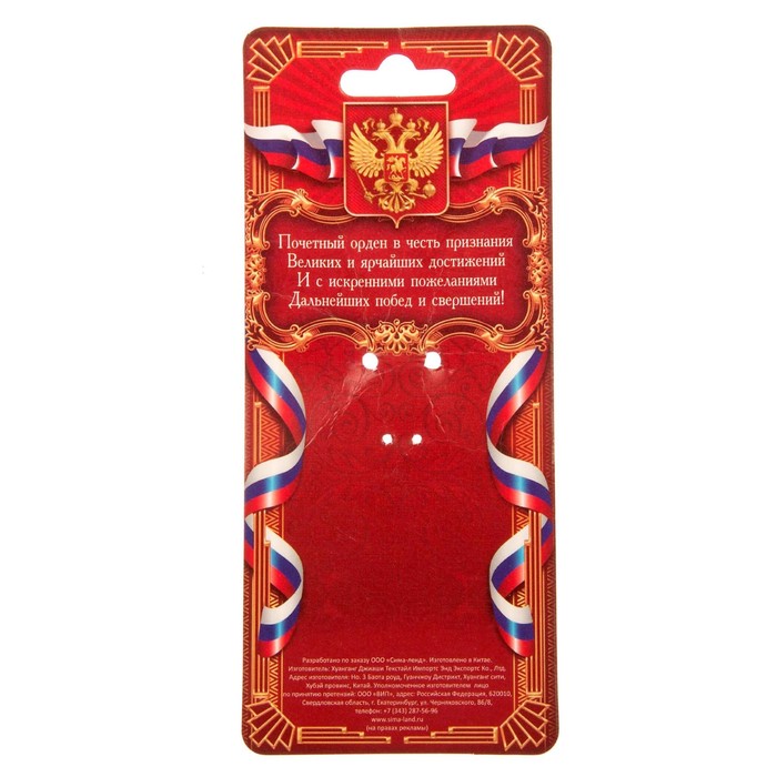 Изысканное оформление изделия будет долго радовать адресата. Шильд с золотым тиснением украшен изображением лавра — древнего символа победы, а колодка — российским триколором. Оборотная сторона дополнена булавкой и гербом РФ.