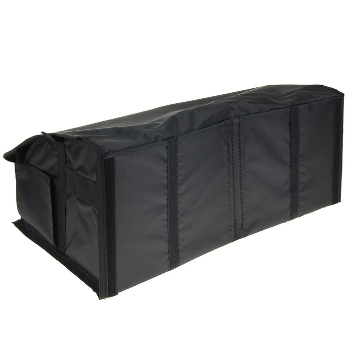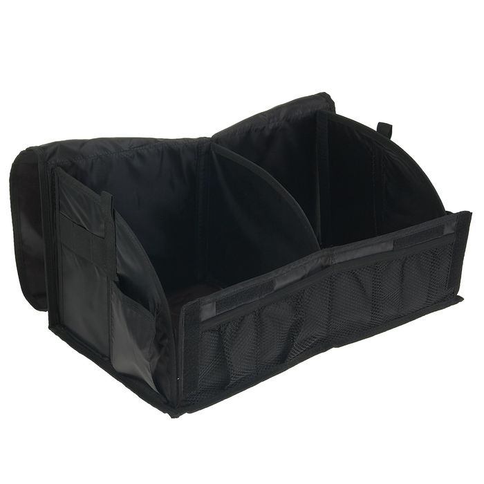 Вместительный органайзер практичного чёрного цвета предназначен для хранения разных вещей и автомобильных принадлежностей. Оснащён двумя отсеками и сетчатыми отделениями-карманами на внешней стороне. Такой аксессуар удобно разместится в багажнике автомобиля и обеспечит быстрый доступ к необходимым вещам.