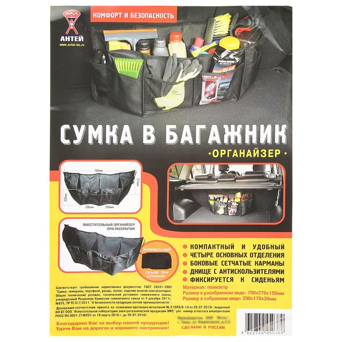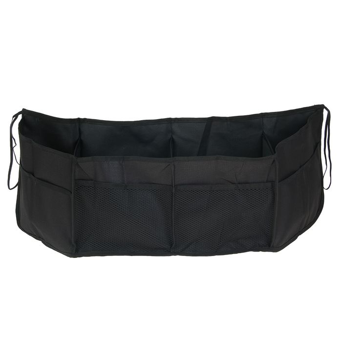 Вместительный органайзер практичного чёрного цвета предназначен для хранения разных вещей и автомобильных принадлежностей. Оснащён отсеками и сетчатыми отделениями-карманами на внешней стороне. Такой аксессуар удобно разместится в багажнике автомобиля и обеспечит быстрый доступ к необходимым вещам.
