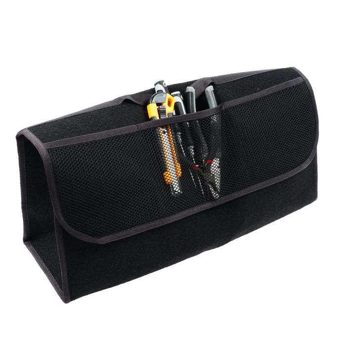 Вместительный органайзер практичного чёрного цвета предназначен для хранения разных предметов и автомобильных принадлежностей. Оснащён сетчатыми отделениями-карманами на внешней стороне. Такой аксессуар вы удобно расположите в багажнике и обеспечите быстрый доступ к необходимым вещам.