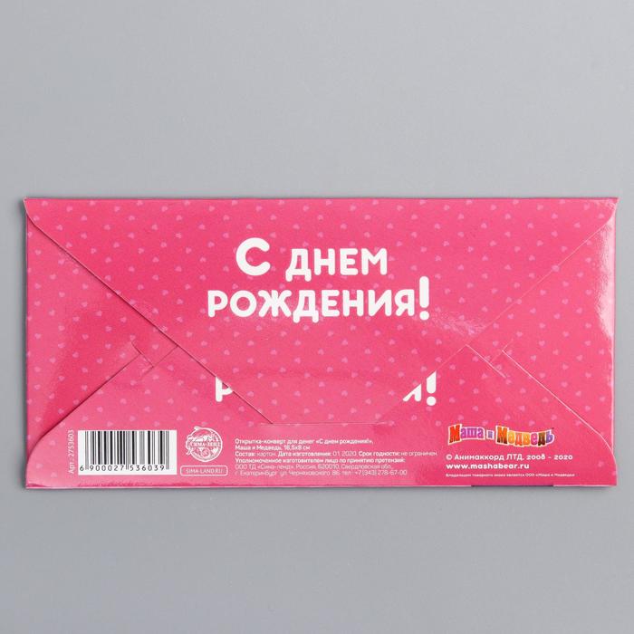 Открытка-конверт для денег "С Днем рождения", Маша и Медведь, 16.5 х 8 см
