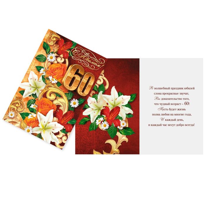 Выразить свои чувства и дополнить основной подарок тёплыми словами вам поможет Открытка «С Юбилеем 60 лет», лилии, 12 х 18 см. С ней ваше пожелание «Счастья, любви и здоровья» приобретёт трепетный и душевный подтекст. А воспоминания о праздничном дне ещё долго будут радовать адресата.