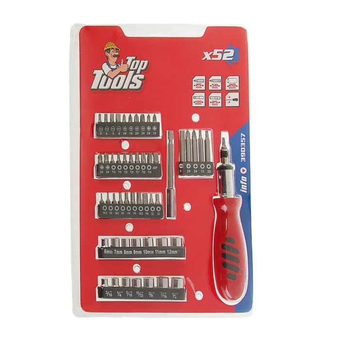 Стройте грандиозные планы, реализуйте свои идеи и не бойтесь знакомиться с новыми материалами и техниками. У вас всё получится, ведь у нас вы найдете инструмент как для бытового использования, так и для профессиональной деятельности. Может быть, Отвертка с битами Top Tools, набор 52 шт., с реверсом, адаптер в комплекте — это именно то, что вы всегда искали.
