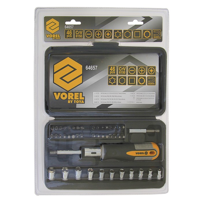 Стройте грандиозные планы, реализуйте свои идеи и не бойтесь знакомиться с новыми материалами и техниками. У вас всё получится, ведь у нас вы найдете инструмент как для бытового использования, так и для профессиональной деятельности. Может быть, Отвёртка с набором бит и головок VOREL, 1/4", магнитная — это именно то, что вы всегда искали.