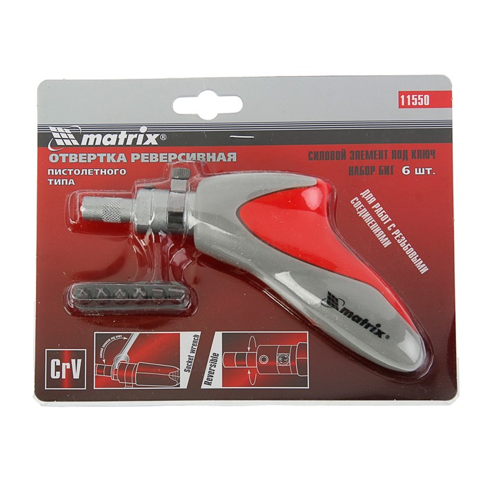Отвёртка с набором бит MATRIX, CrV, реверсивная, пистолетного типа, 6 предметов