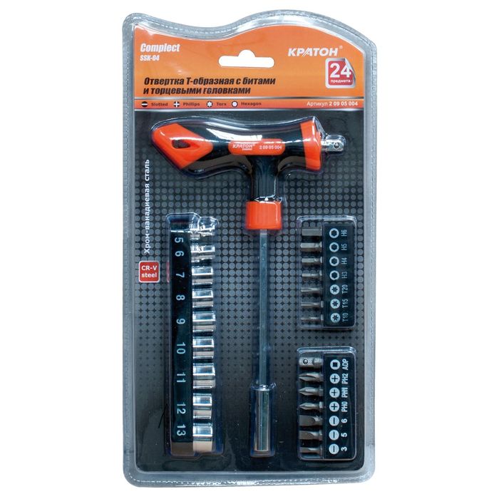 Отвертка Т-образная с битами и торцевыми головками Кратон Complect SSK-04, набор 24 пр.