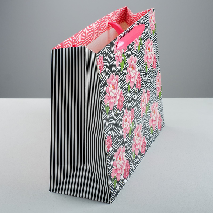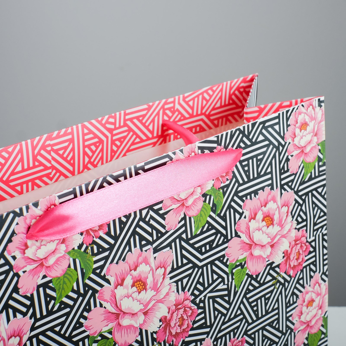 Изделие изготовлено из более плотного материала по сравнению с обычными бумажными пакетами. Оно прекрасно подойдёт как для упаковки подарка, так и для повседневной носки в качестве стильной сумки. Несомненным достоинством является длинная ручка, позволяющая носить вещь на плече. При необходимости складывается. Благодаря компактному размеру не займёт много места.