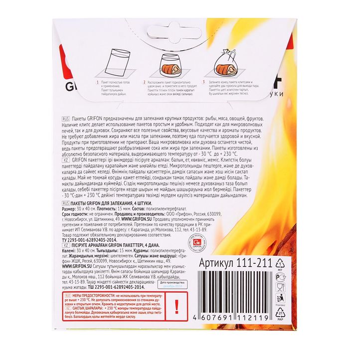 Пакеты для запекания GRIFON универсальные 30х40 см, с клипсами, 4 шт.
