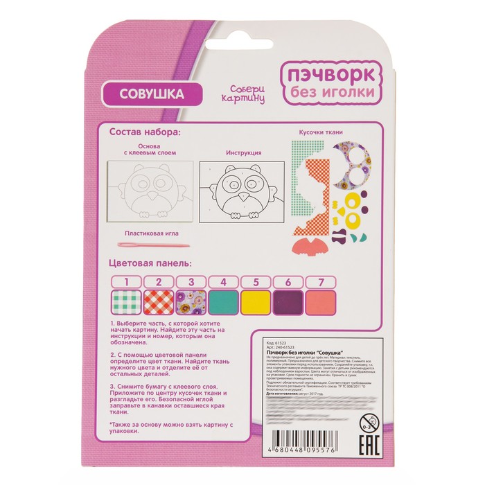 Может быть, именно такой необычный товар, как Пэчворк без иголки "Совушка", раскроет неожиданные способности у вашего ребёнка. И даже если он не станет новым Рафаэлем, то ему, определённо, обеспечена богатая фантазия, креативное мышление и золотые руки.