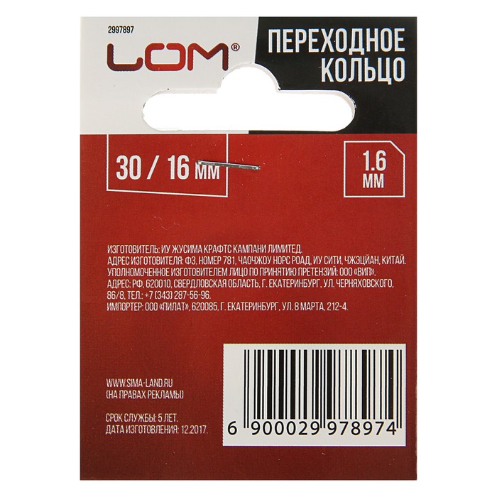 Переходное кольцо LOM 30/16 для пильных дисков, 1,6мм