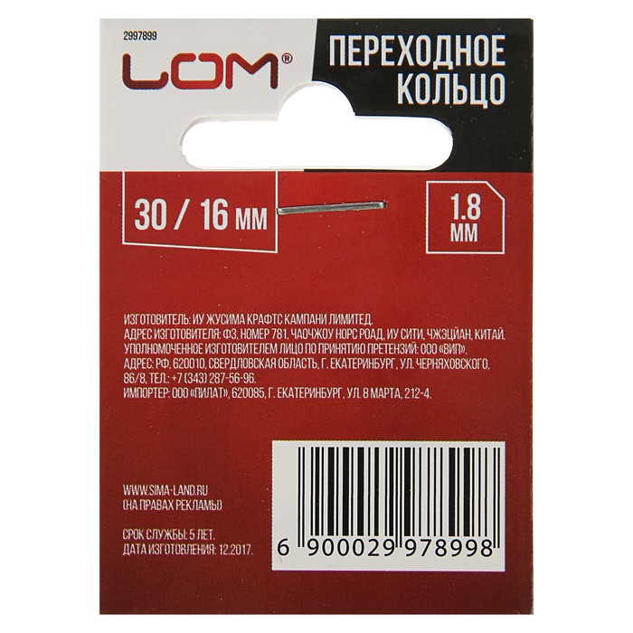 Переходное кольцо LOM 30/16 для пильных дисков, 1,8мм