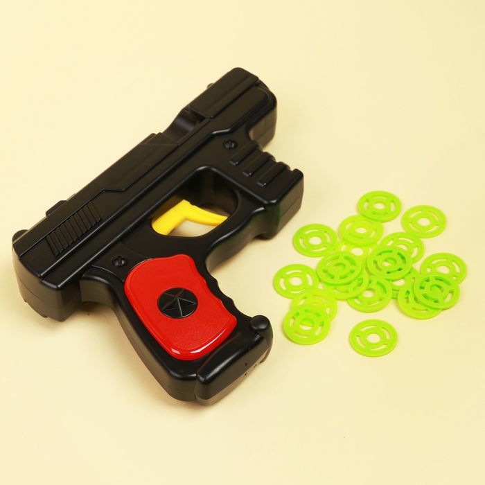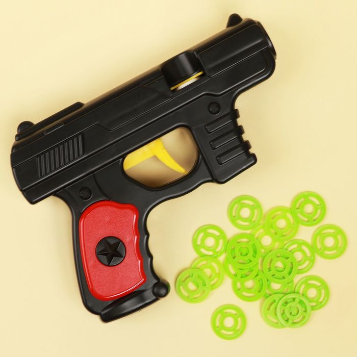 С таким пистолетом игра в войнушку станет ещё увлекательней! Яркое оружие заряжается специальными снарядами-дисками, которые вылетают из ствола на небольшое расстояние при нажатии на курок. Малыш потренируется в точности при стрельбе по мишеням и устроит состязание с друзьями.