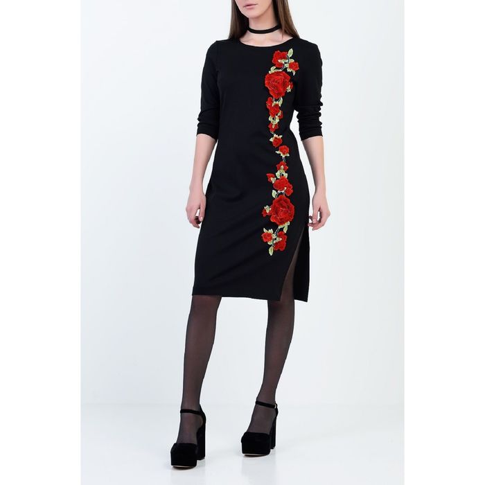 - Платье прилегающего силуэта сшито из плотного трикотажа.