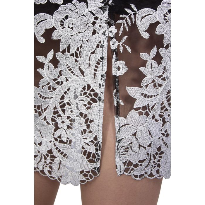 Платье выполнено из кружевного полотна.
