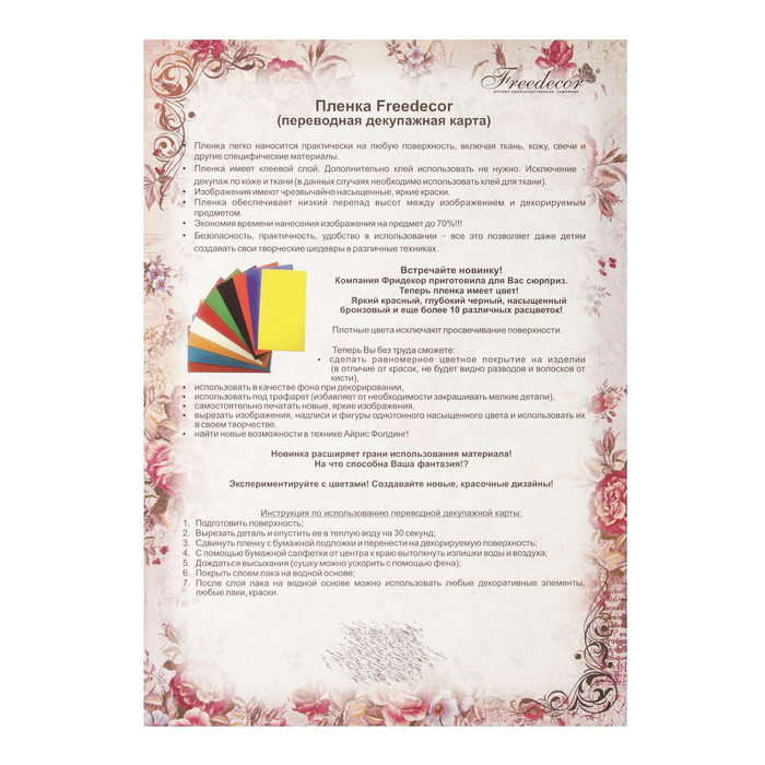 Плёнка с клеевым слоем для декора и декупажа легко наносится практически на любую поверхность, включая ткань, кожу и другие материалы. Изображения имеют насыщенные яркие краски, благодаря чему готовое изделие «оживает».