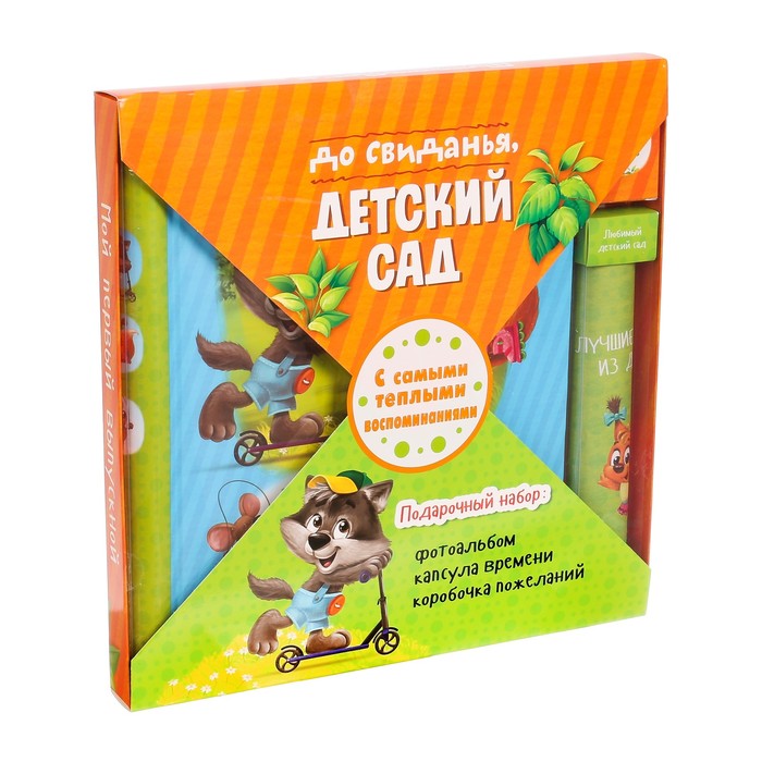 Подарочный набор "До свидания, детский сад": фотоальбом на 20 магнитных листов, капсула времени и коробочка пожеланий