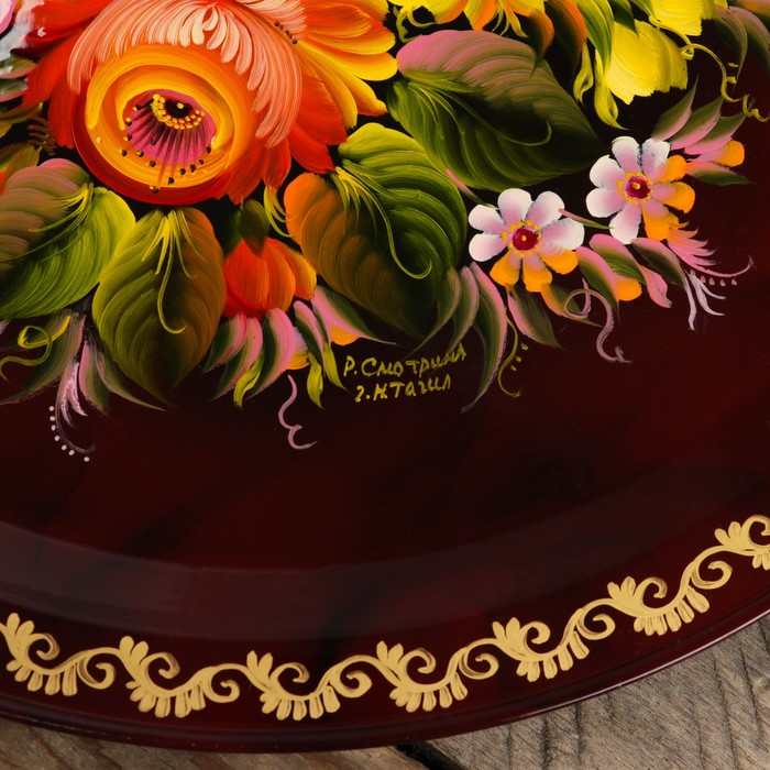 Поднос «Цветы», бордовый фон, D=32 см, ручная роспись