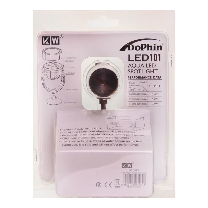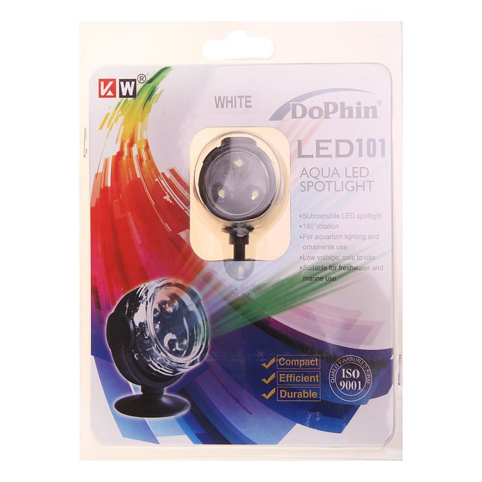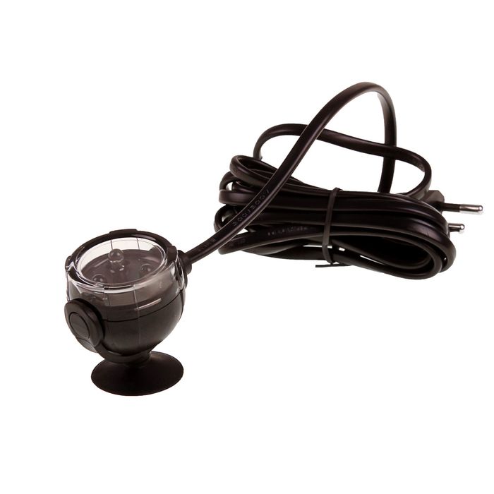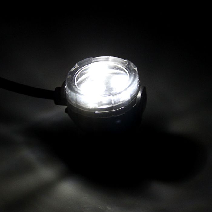 Водонепроницаемая светодиодная подсветка белого цвета на присоске, устанавливается на дне или стенке аквариума. Есть возможность настроить угол направления луча.