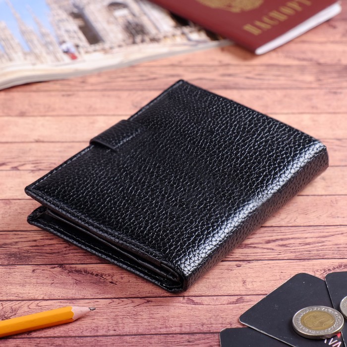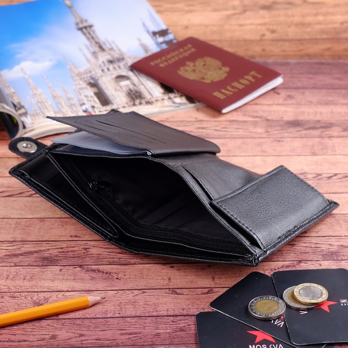 Портмоне мужское 3 в 1, для автодокументов, для паспорта, 2 отдела, для монет, для карт, цвет чёрный
