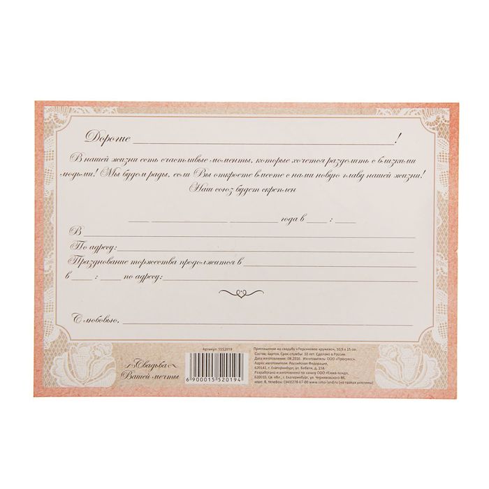 Мы предлагаем приглашение (10,5 × 15 см) с эксклюзивной дизайном, который каждому придётся по душе! На обороте карточки расположен текст со свободными полями для имени адресата, времени, даты и адреса проведения мероприятия. Мы продумали все детали, вам остаётся заполнить строки и вручить их гостям!