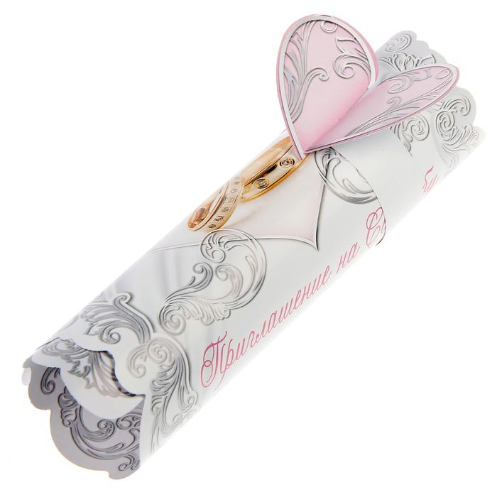 Приглашение имеет оригинальную резную форму и дополнено элегантной картонной лентой с застёжкой-сердцем, которая украшает и скрепляет свиток. Нежные оттенки, традиционные свадебные мотивы и орнамент подойдут практически к любому оформлению торжества. Внутри вы найдёте текст приглашения с тёплыми словами для адресата.