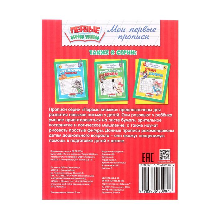 Прописи серии «Первые книжки» предназначены для детей дошкольного возраста. Они помогают развивать мелкую моторику и мышление, учат запоминать и писать буквы и цифры, а также рисовать различные фигуры по клеткам и линиям. Такие навыки подготовят руку ребёнка к письму и к школе!