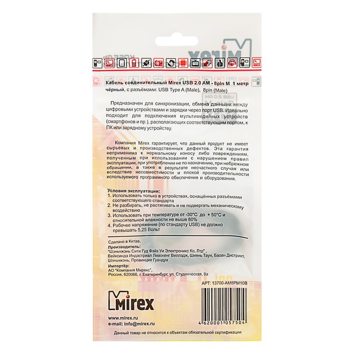 Провод для зарядки и передачи данных Mirex USB 2.0 AM - 8pin M 1 метр черный