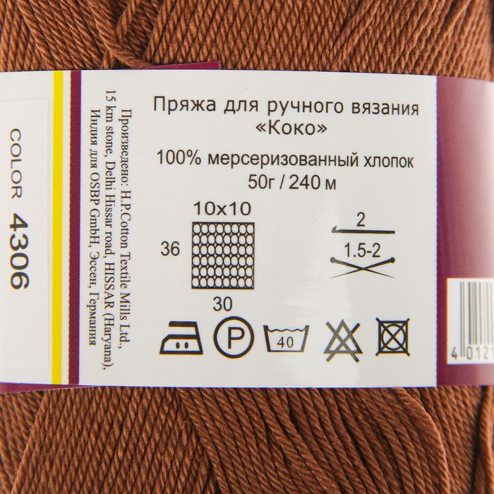 Пряжа "Coco" 100% мерсеризованный хлопок 240м/50гр (4306 коричневый)