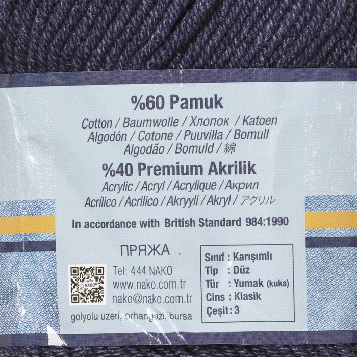 Пряжа "Denim" 60% хлопок, 40% акрил 200м/100гр (11589 т. синий)