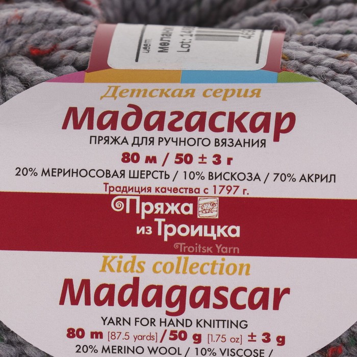 Пряжа "Мадагаскар" 20% меринос. шерсть, 10% вискоза, 70% акрил 80м/50гр (8384 серый)