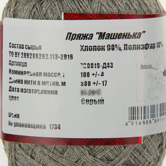 Пряжа "Машенька" 90% хлопок, 10% полиэфир 580м/100гр (Серый)
