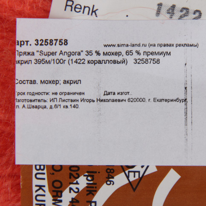 Пряжа "Super Angora" 35 % мохер, 65 % премиум акрил 395м/100г (1422 коралловый)