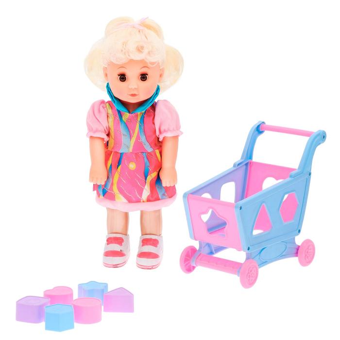 В набор входит: пупс, тележка - сортер с фигурами геометрической формы.