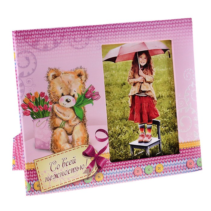 Рамка для фото 8,5 х 12,5 см "Со всей нежностью" - это не только уникальный предмет интерьера, но и маленький хранитель самых ярких воспоминаний, запечатленных на снимках. Эксклюзивный дизайн, впитавший в себя нежную цветовую гамму, принт с изображением милого плюшевого мишки, а также оригинальную форму, делает изделие неповторимым, способным стать декоративной «изюминкой» вашего дома.