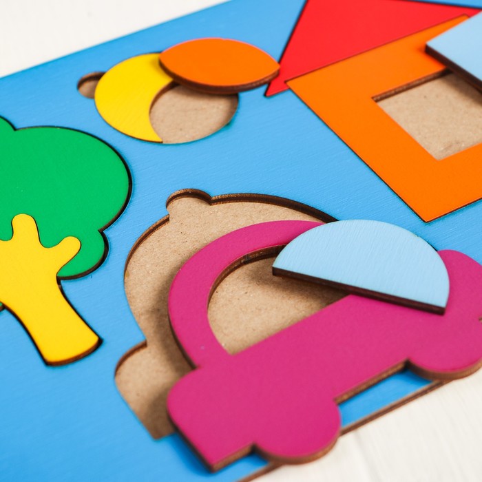 Данная головоломка поможет малышу улучшить сенсорное восприятие, а также изучить цвета, формы. Крохе предстоит соотнести элемент вкладки с подходящим отверстием в основе и собрать домик на картинке. Хотя эти упражнения кажутся довольно простыми, такие действия очень полезны для развития логического мышления.