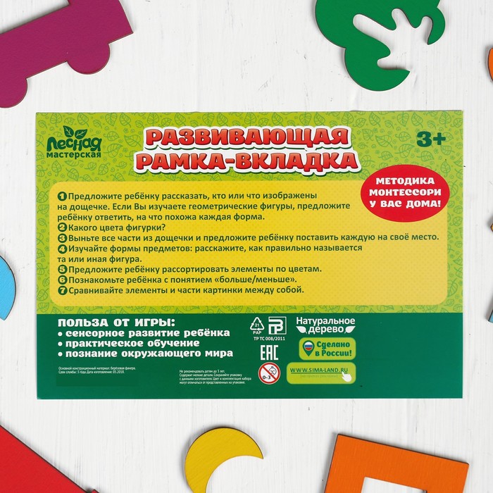 Во время занятий с рамкой-вкладышем предложите ребёнку дополнительные задания, например называть цвет каждой детальки. Варианты вопросов вы найдёте на упаковке изделия.
