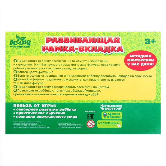 Во время занятий с рамкой-вкладышем предложите ребёнку дополнительные задания, например называть цвет каждой детальки. Варианты вопросов вы найдёте на упаковке изделия.