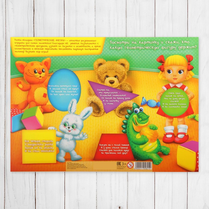 Поддержать врождённую любознательность поможет рамка-вкладыш. Она познакомит малыша с геометрическими фигурами, их названиями и особенностями. А весёлые стихи на обороте превратят обучение в игру.