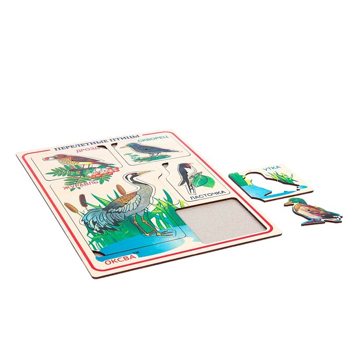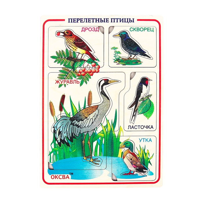 Красочное пособие познакомит кроху с разными видами перелётных птиц. Помогите ему найти место на деревянном основании для каждой картинки. Обсудите вместе с малышом образ жизни птиц, их строение. Фигурки можно использовать в качестве трафаретов для рисования.