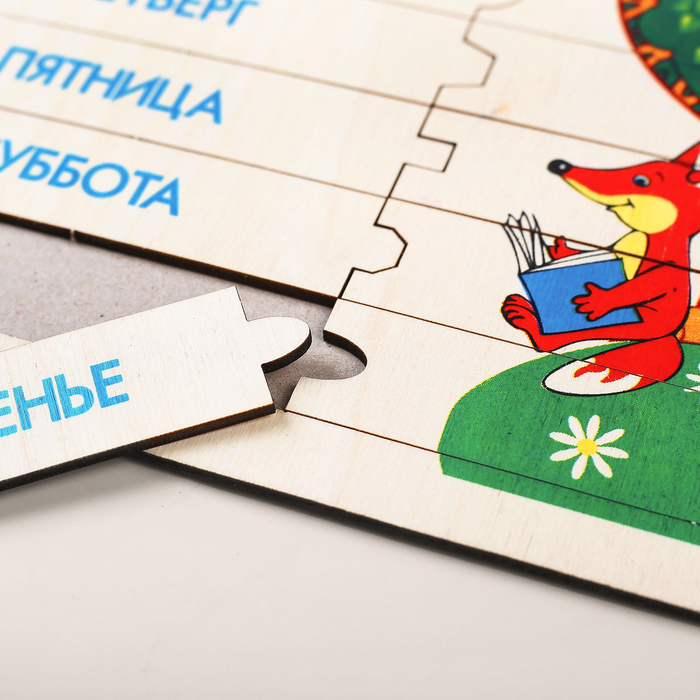 Красочное пособие познакомит кроху с днями недели. Помогите ему найти место на деревянном основании для каждой надписи и цифры, вместе соберите картинку с животными и обсудите получившийся результат.