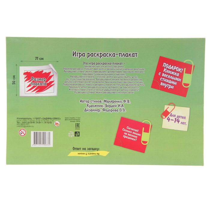 Может быть, именно такой необычный товар, как Раскраска - плакат "Праздник в лесу", в коробке, раскроет неожиданные способности у вашего ребёнка. И даже если он не станет новым Рафаэлем, то ему, определённо, обеспечена богатая фантазия, креативное мышление и золотые руки.