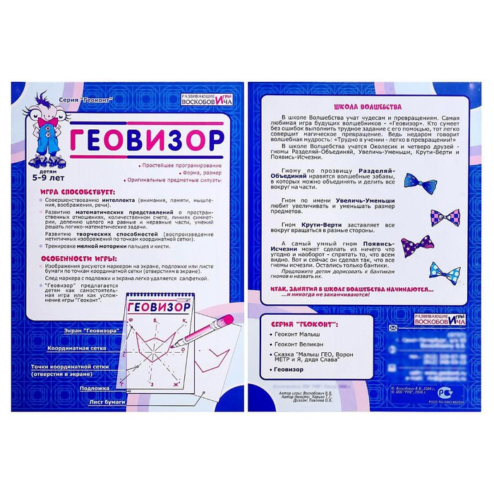 В соответствии с названными координатами ставьте точки на плёнке или подложенном под неё листе бумаги, а затем соединяйте их в силуэтный рисунок. Берите фигуры из альбома схем или придумывайте собственные. Например, ребёнок может пофантазировать и сам нарисовать силуэт, а потом зашифровать его координатами вершин. «Геовизор» предлагается как самостоятельное пособие для детей или как усложнённый вариант игры «Геоконт».